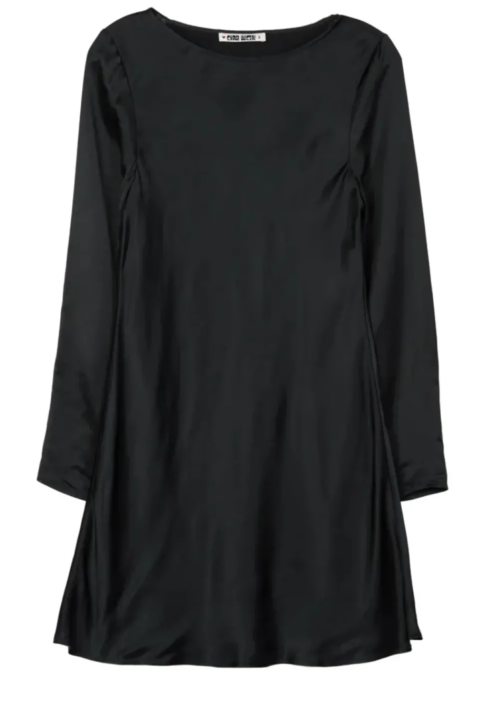 The Patrice Dress in black is a bias cut silky long-sleeved dress.