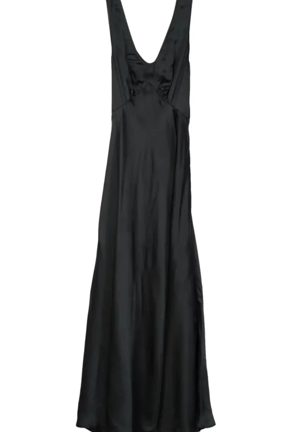 The Reine Dress in black is a sleeveless bias cut slip dress with tie detail at the back.