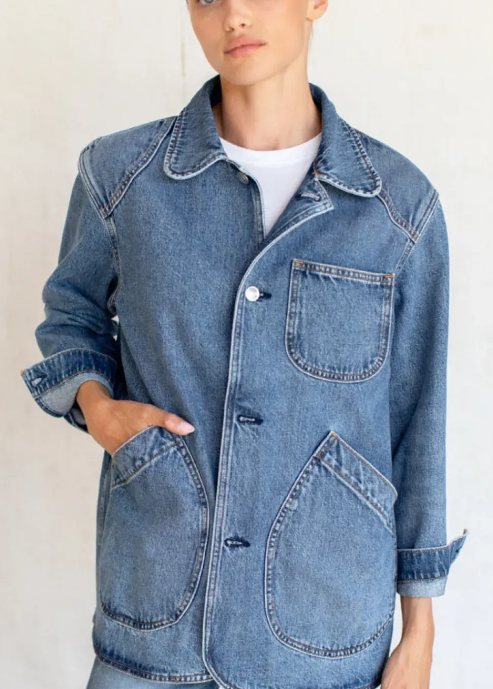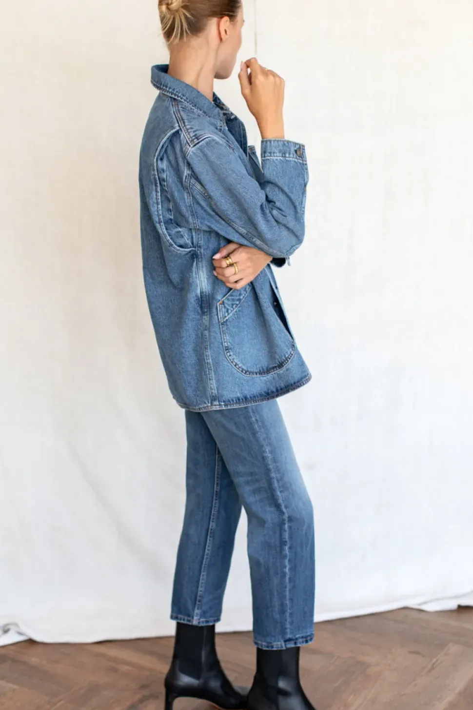 Introducing the Cabin Jacket, a perfect blend of adventure and comfort in 100% cotton Italian denim in a vintage shade. Its relaxed, longer silhouette provides coverage and freedom of movement.