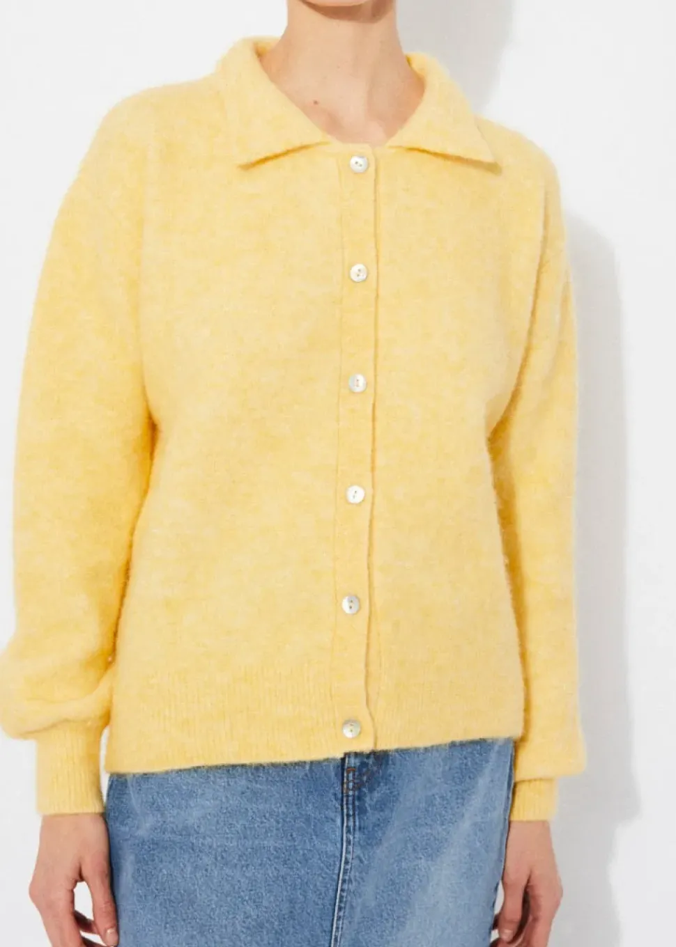 Straight cardigan in soft alpaca knit. Model with collar and front buttons.