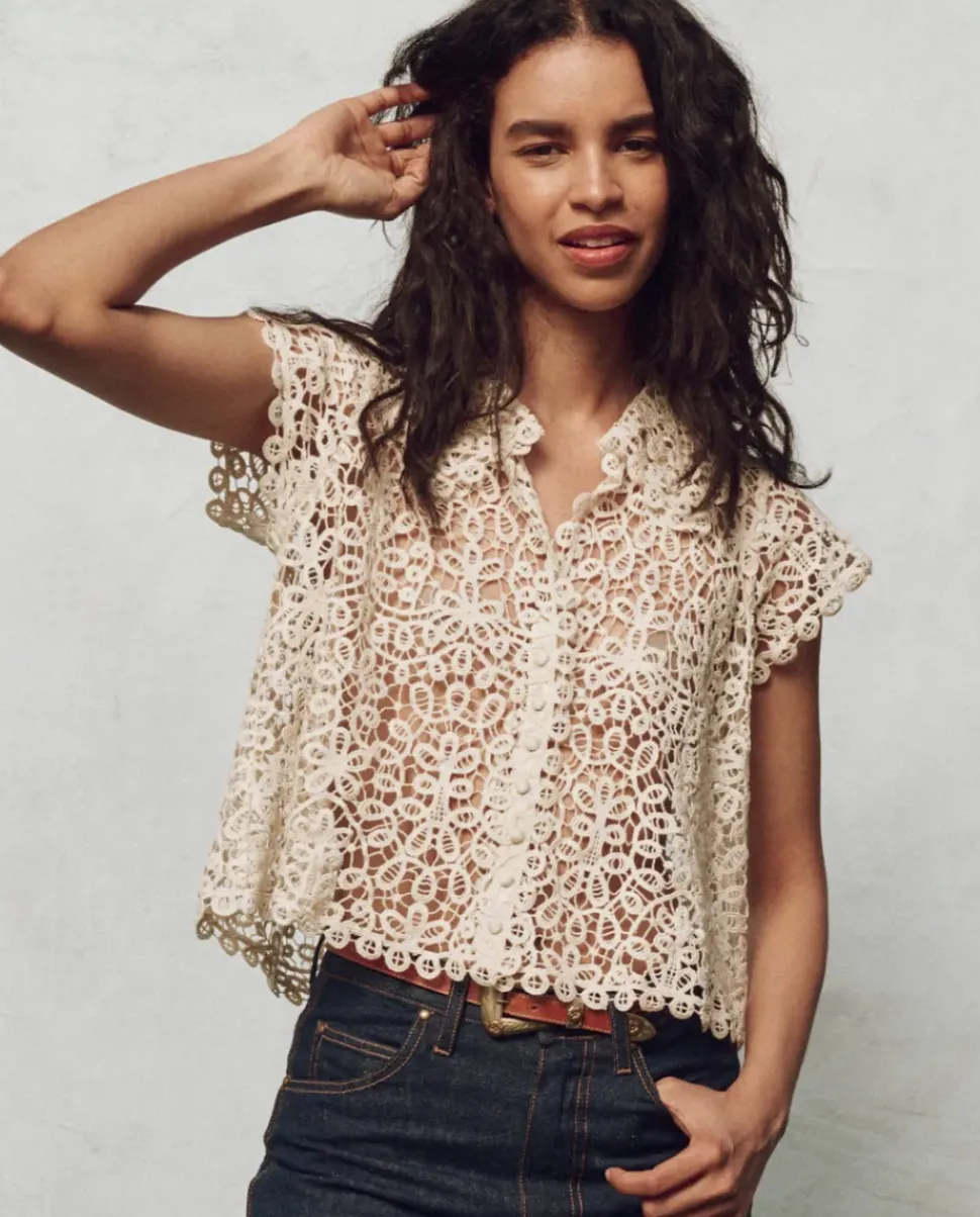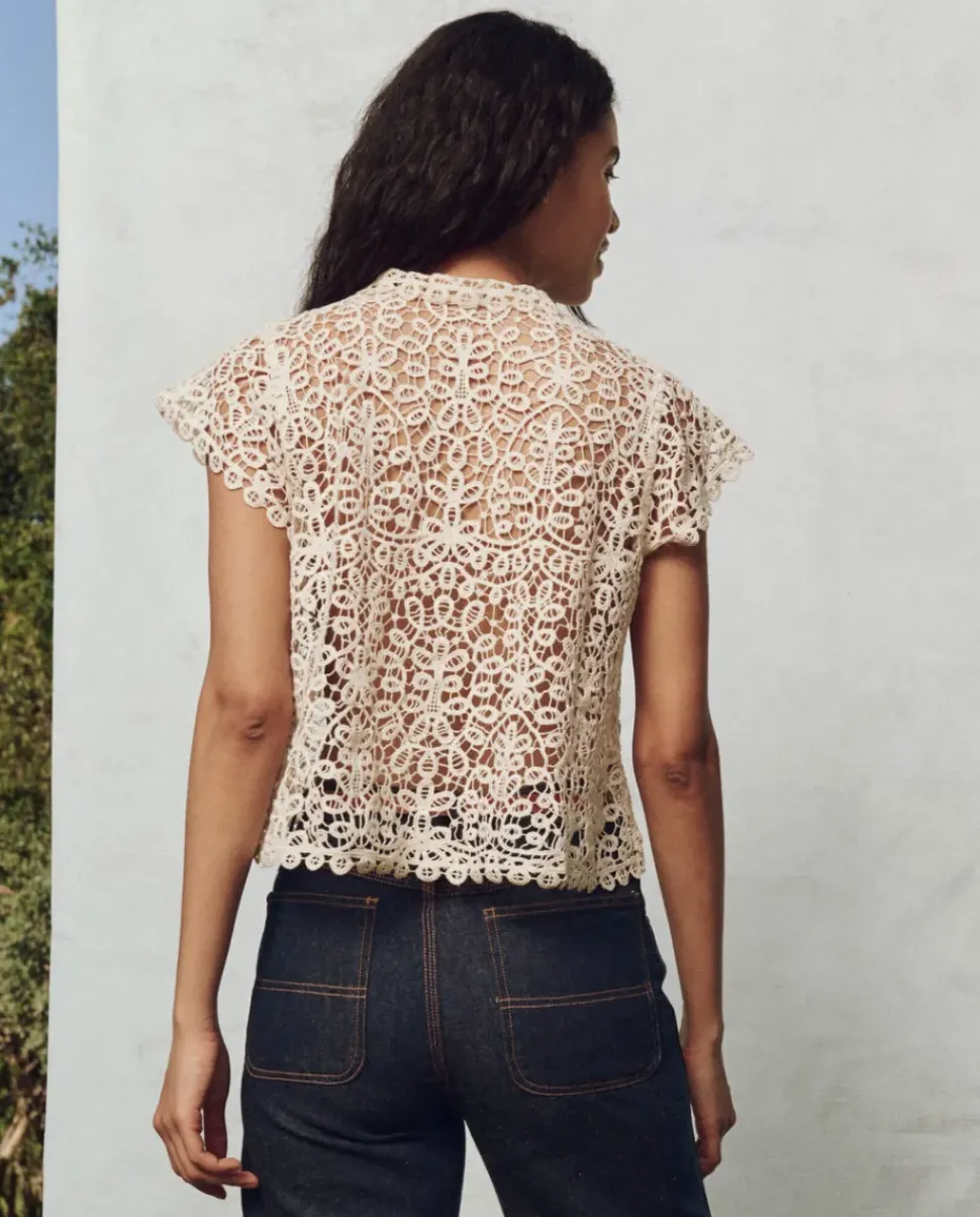 This intricate heavy lace fabric is finished with scalloped lace edges for a refined touch. Features a peaked cap sleeve, a collar, and a boxy fit through the body.