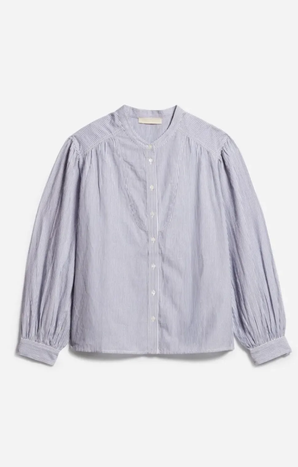 Blue cotton shirt with Mao collar.