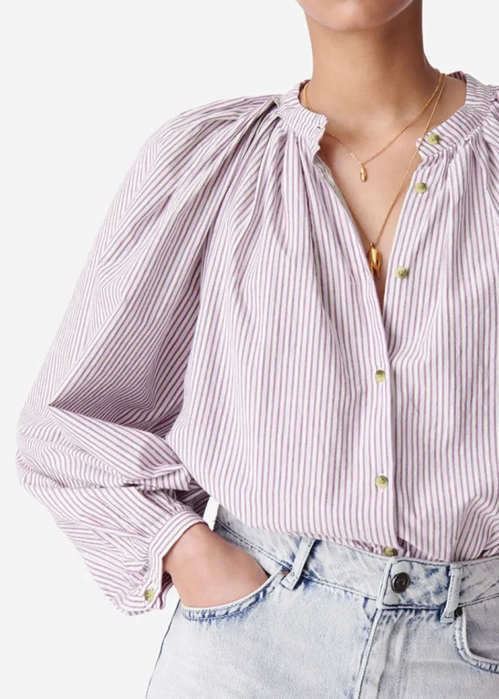 The Sol blouse features gathers and pleats that seem to radiate out from the round collar. Crafted from an attractive cotton poplin, this blouse with its mauve and pink stripes is a feminine take on men’s shirts. With its puffed sleeves, this characterful piece lends itself to both casual and business occasions, pairing perfectly with suit trousers, a skirt or jeans.