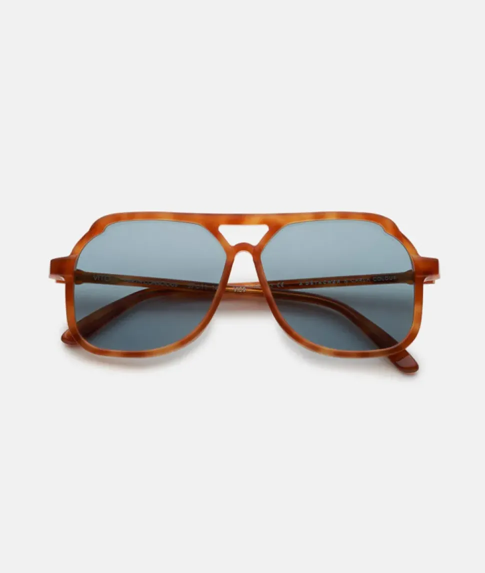Warm light tortise acetate frame with lapis blue bio nylon lens.100% UVA + UVB protection. Cactus leather case + 100% recycled cleaning cloth.