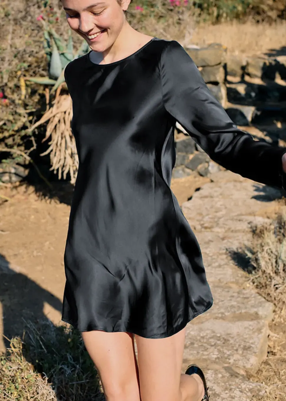 The Patrice Dress in black is a bias cut silky long-sleeved dress.