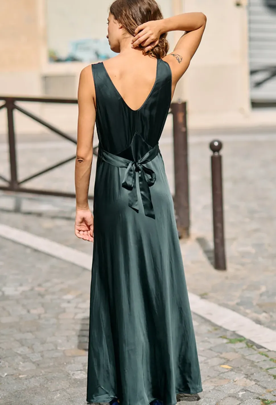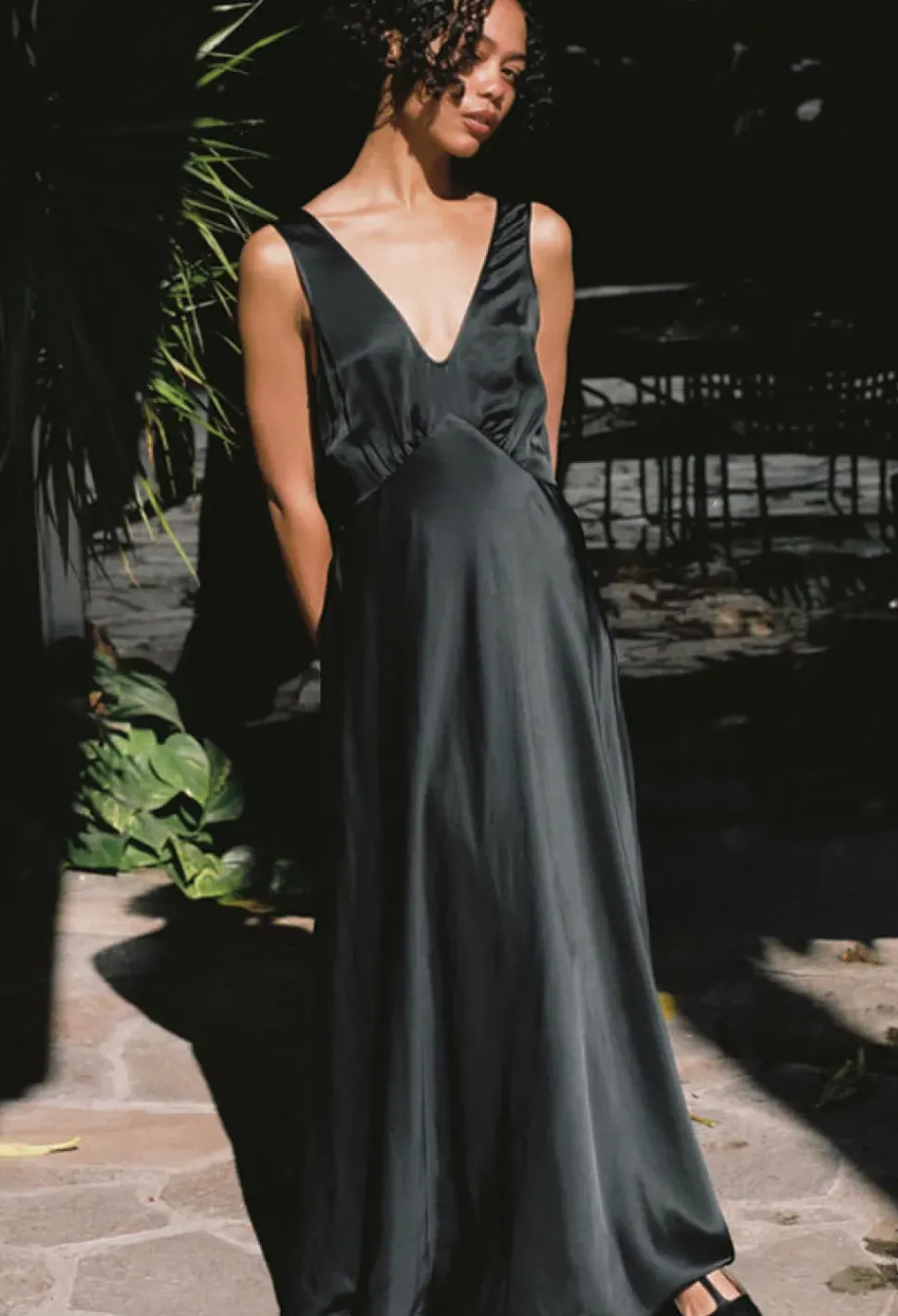 The Reine Dress in black is a sleeveless bias cut slip dress with tie detail at the back.