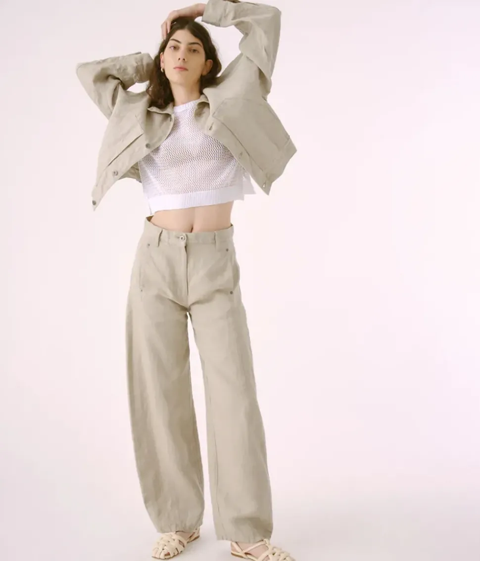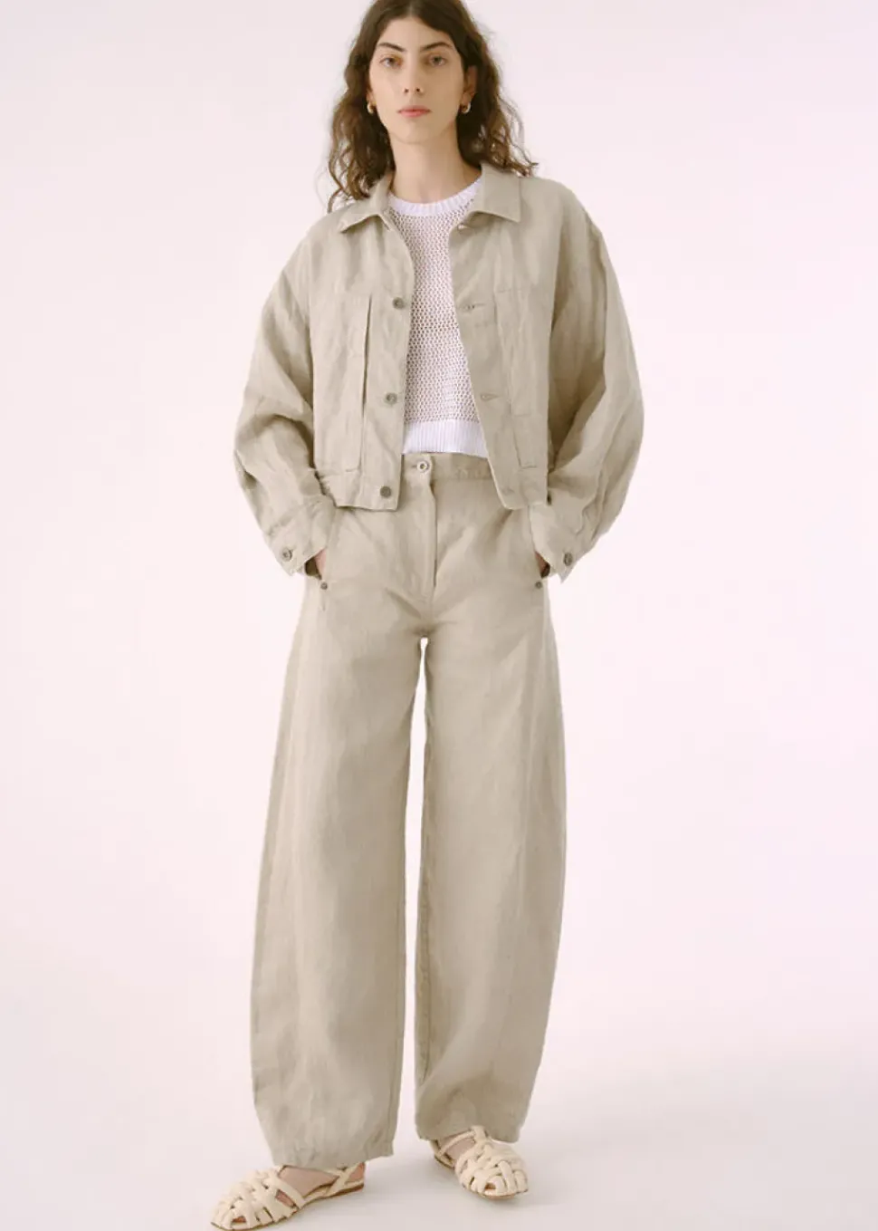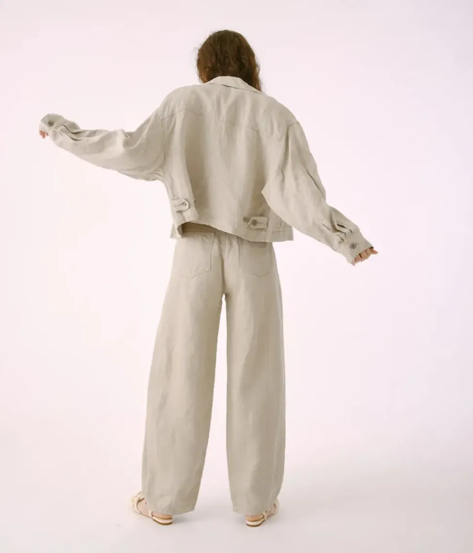 Cropped linen denim jacket. Featuring the large breast pocket, cropped length with wide sleeve.