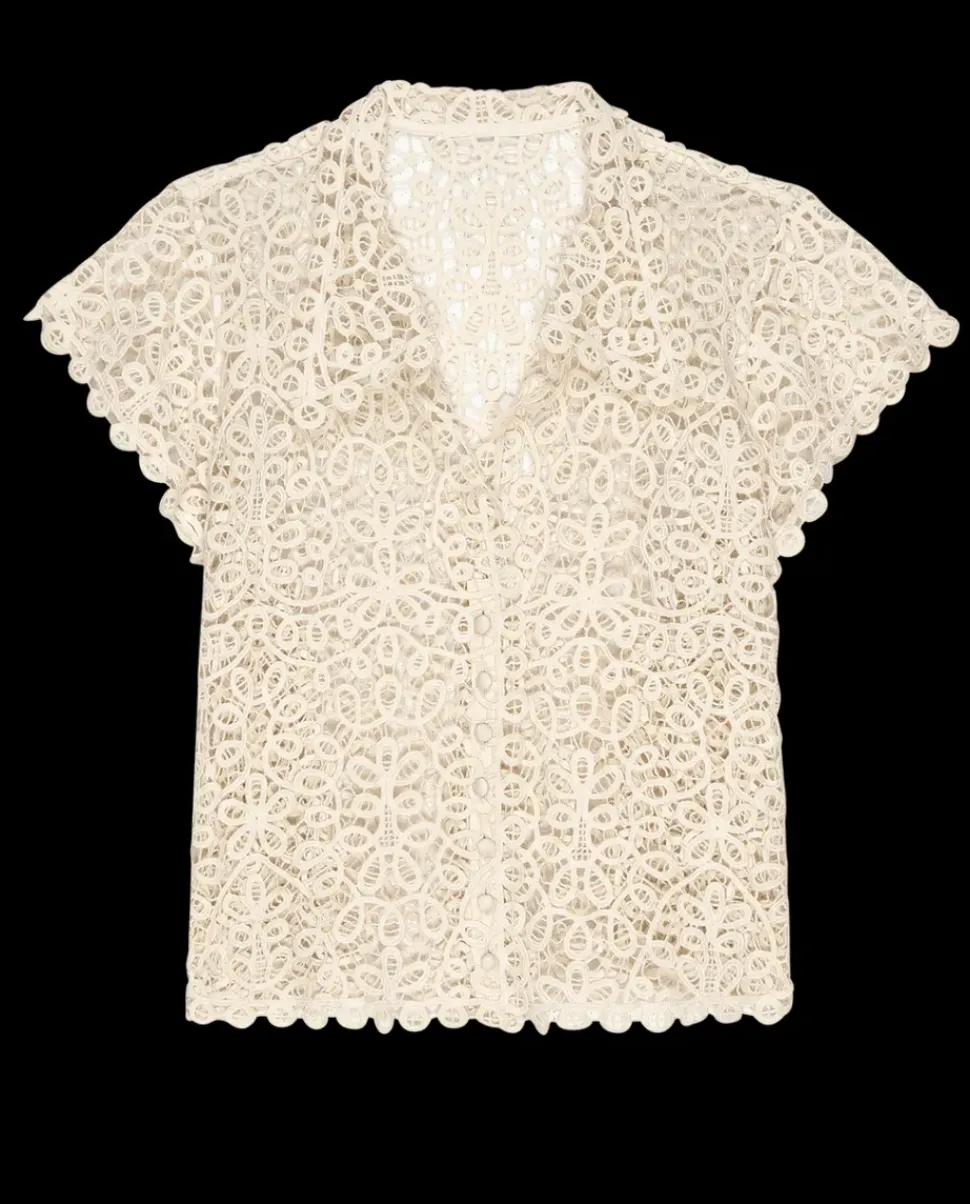 This intricate heavy lace fabric is finished with scalloped lace edges for a refined touch. Features a peaked cap sleeve, a collar, and a boxy fit through the body.