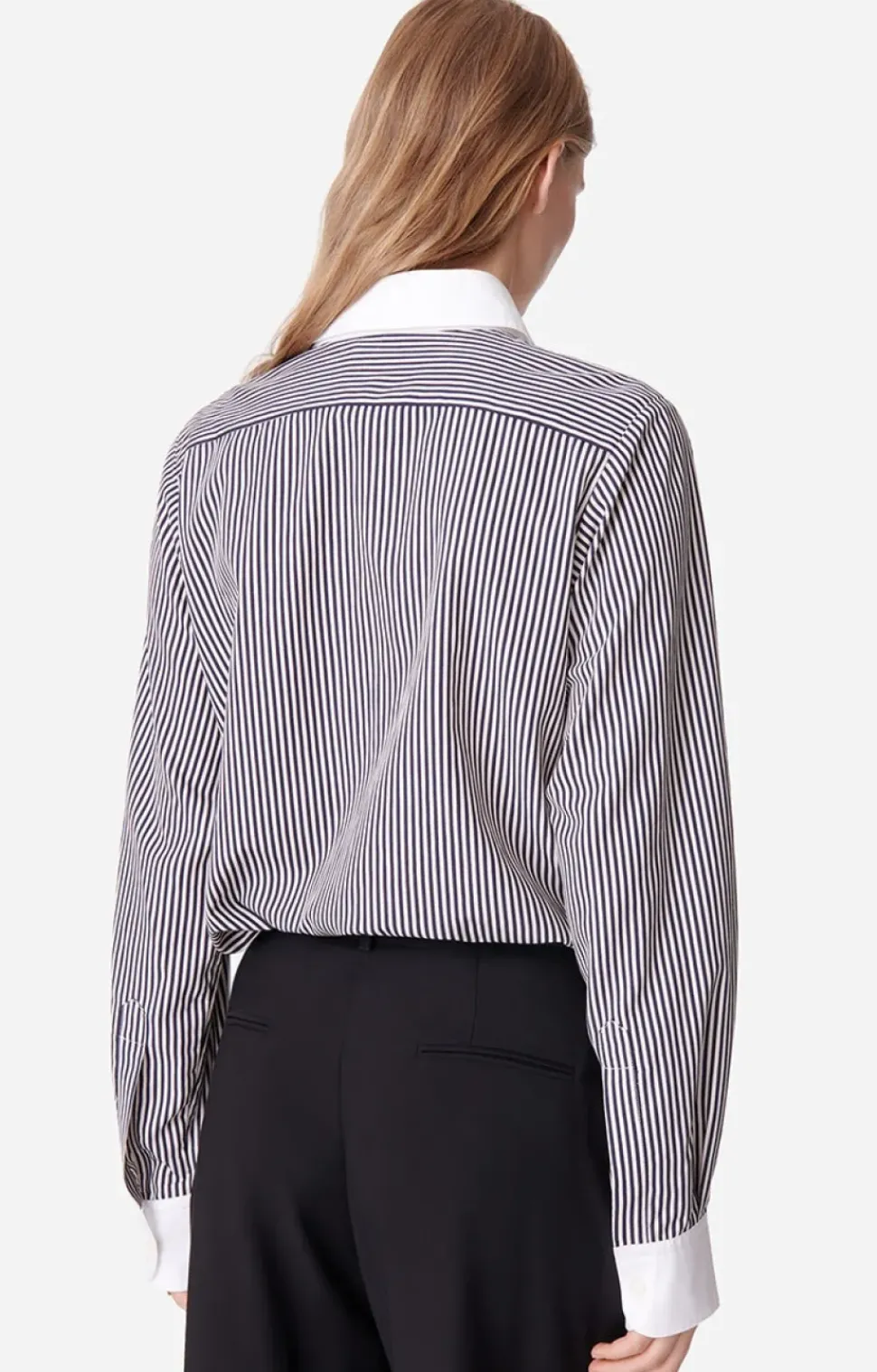 The Dario shirt revisits the masculine shirt for a more feminine version, crafted in viscose voile. Its black and white stripes, enhanced by white contrasts on the button placket, collar and cuffs, add relief. Its straight, flowing cut offers a pleasant, airy feel.