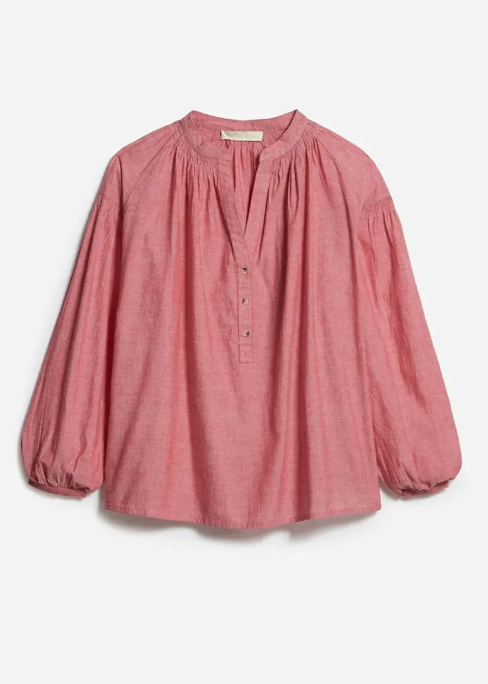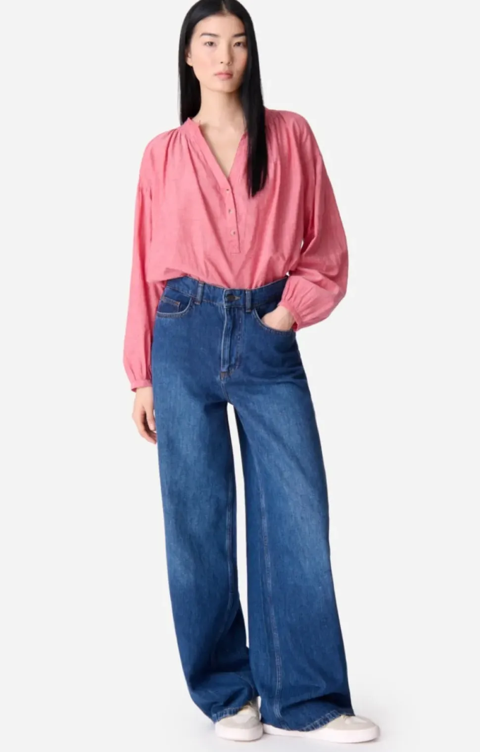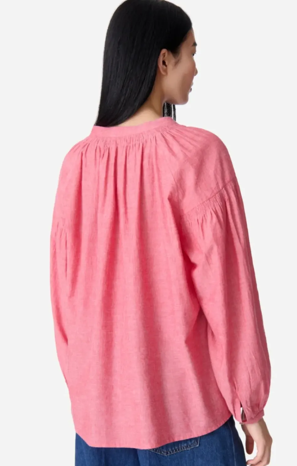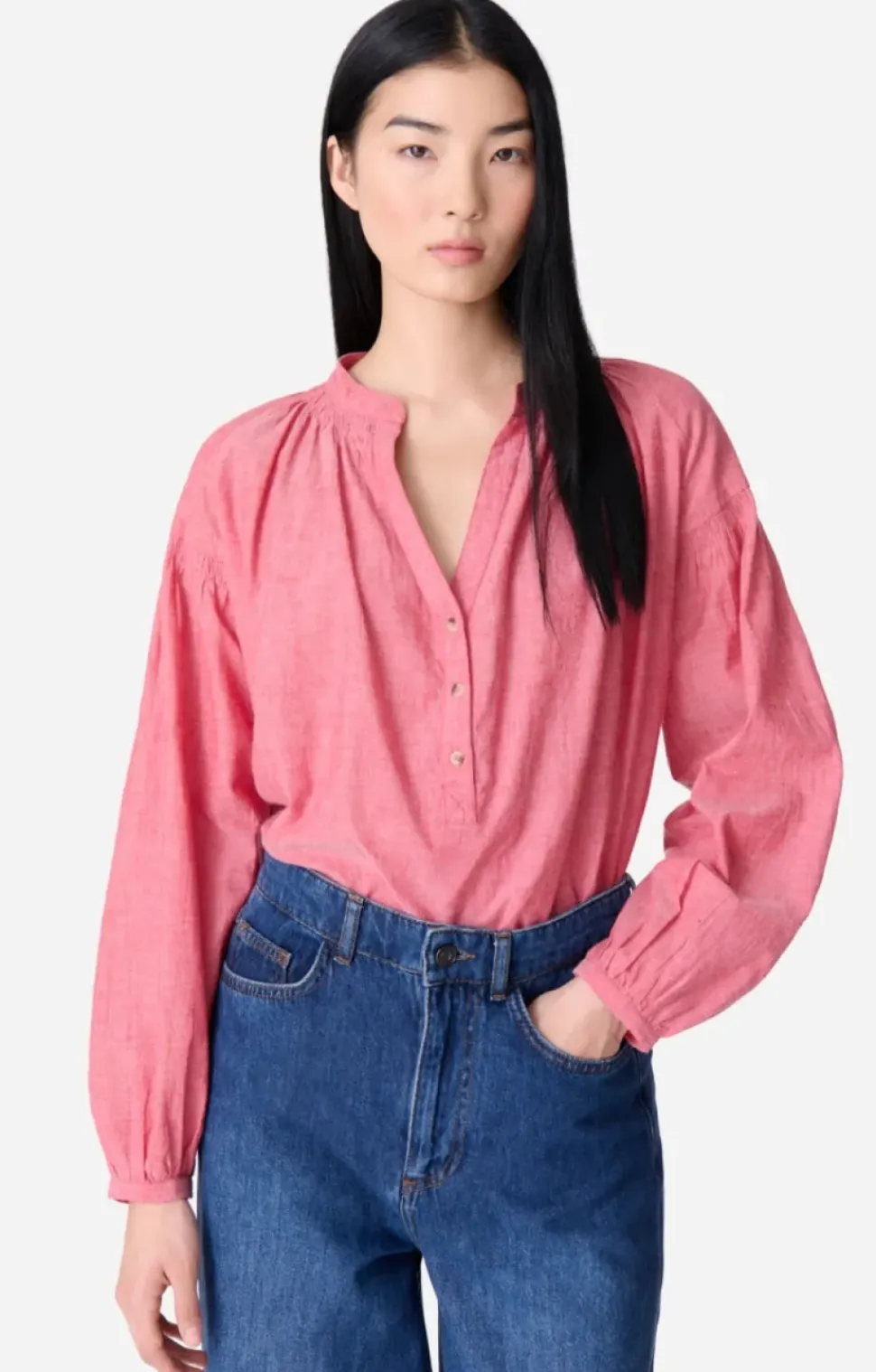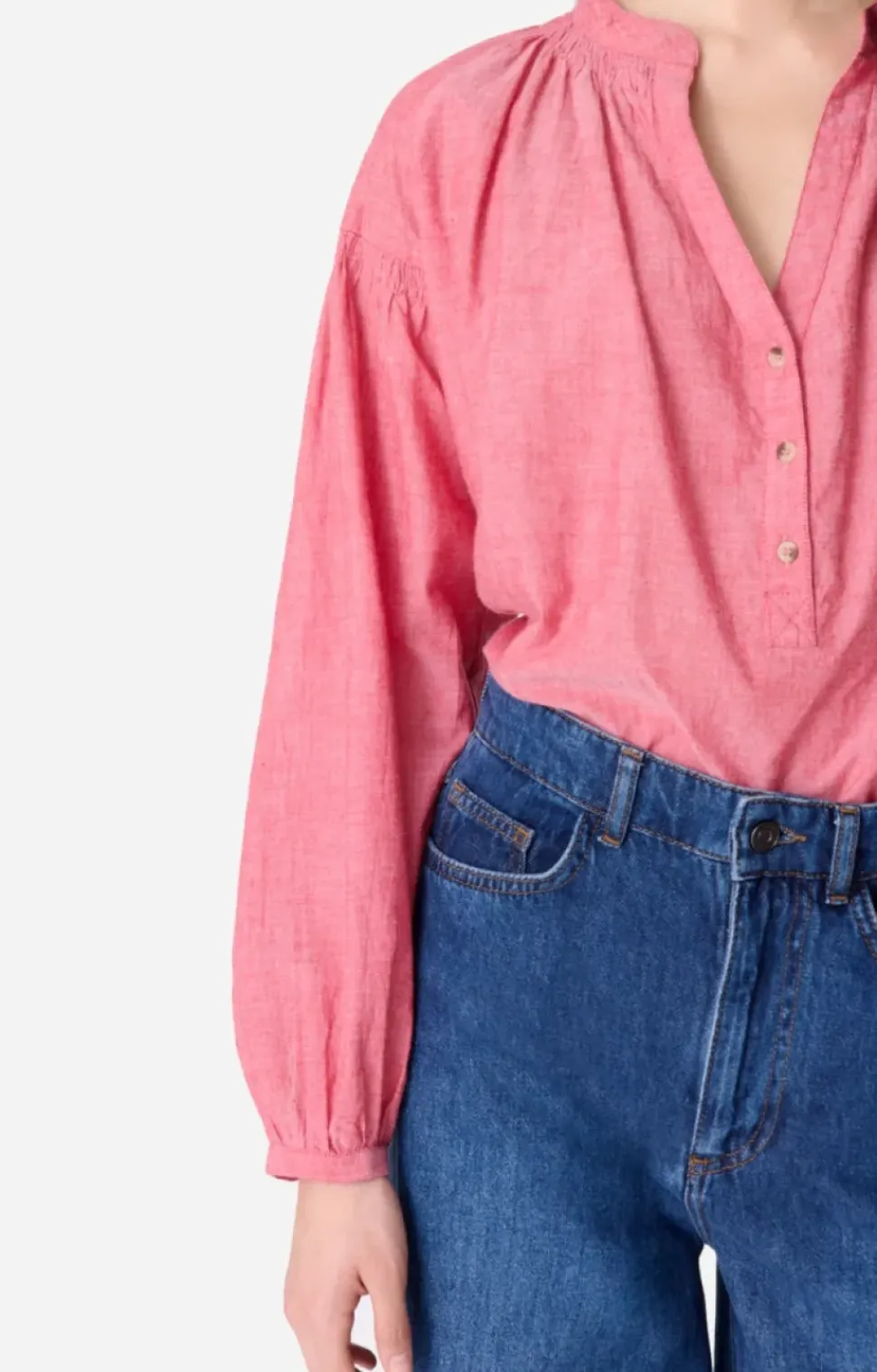 The house’s signature blouse. Its airy cut in light, subtly sheer cotton makes Nipoa the ultimate romantic blouse. Its silhouette is defined by dropped shoulders and gathered details on the sleeves. This season it comes in a bright pink mottled cotton. Wear with jeans or a skirt.