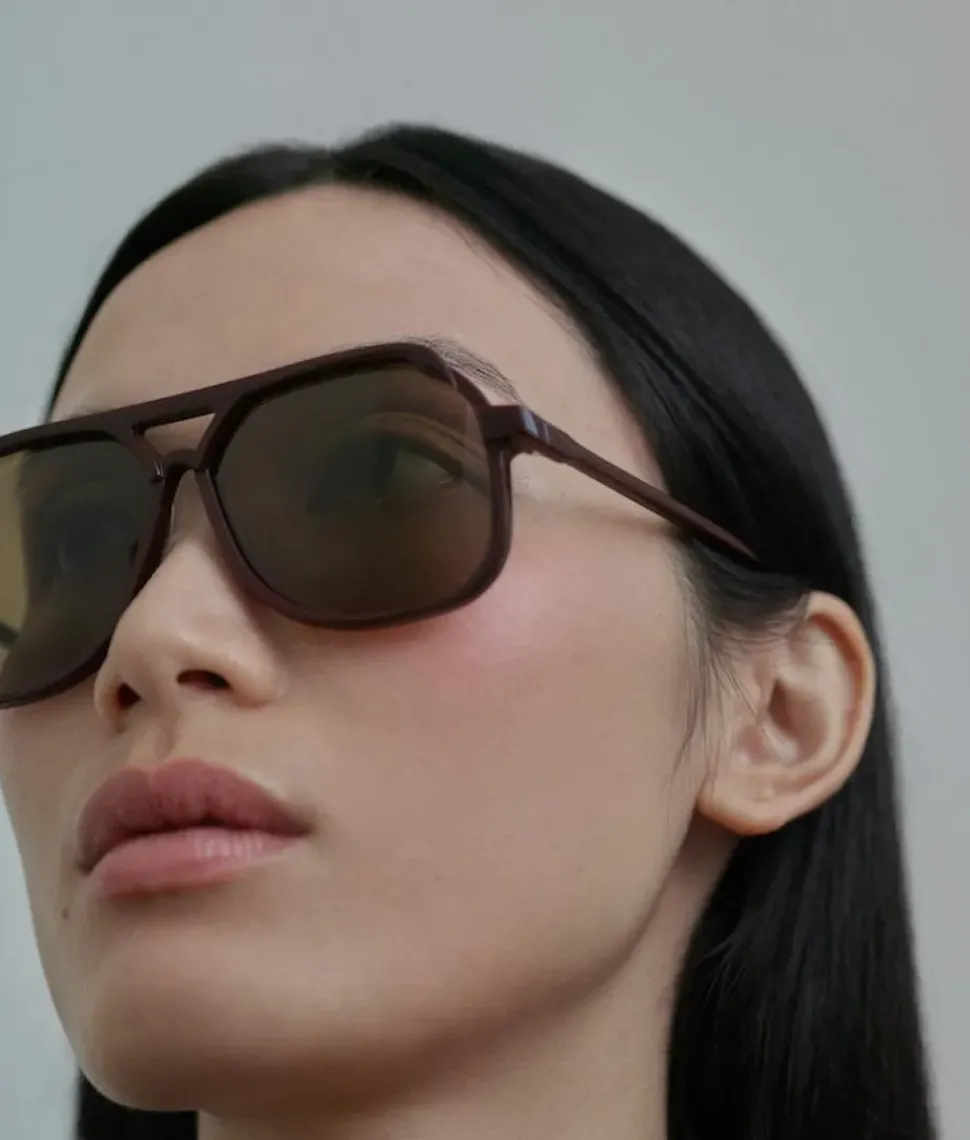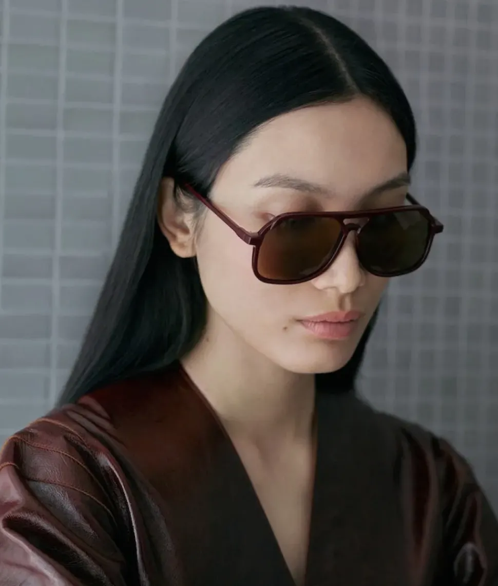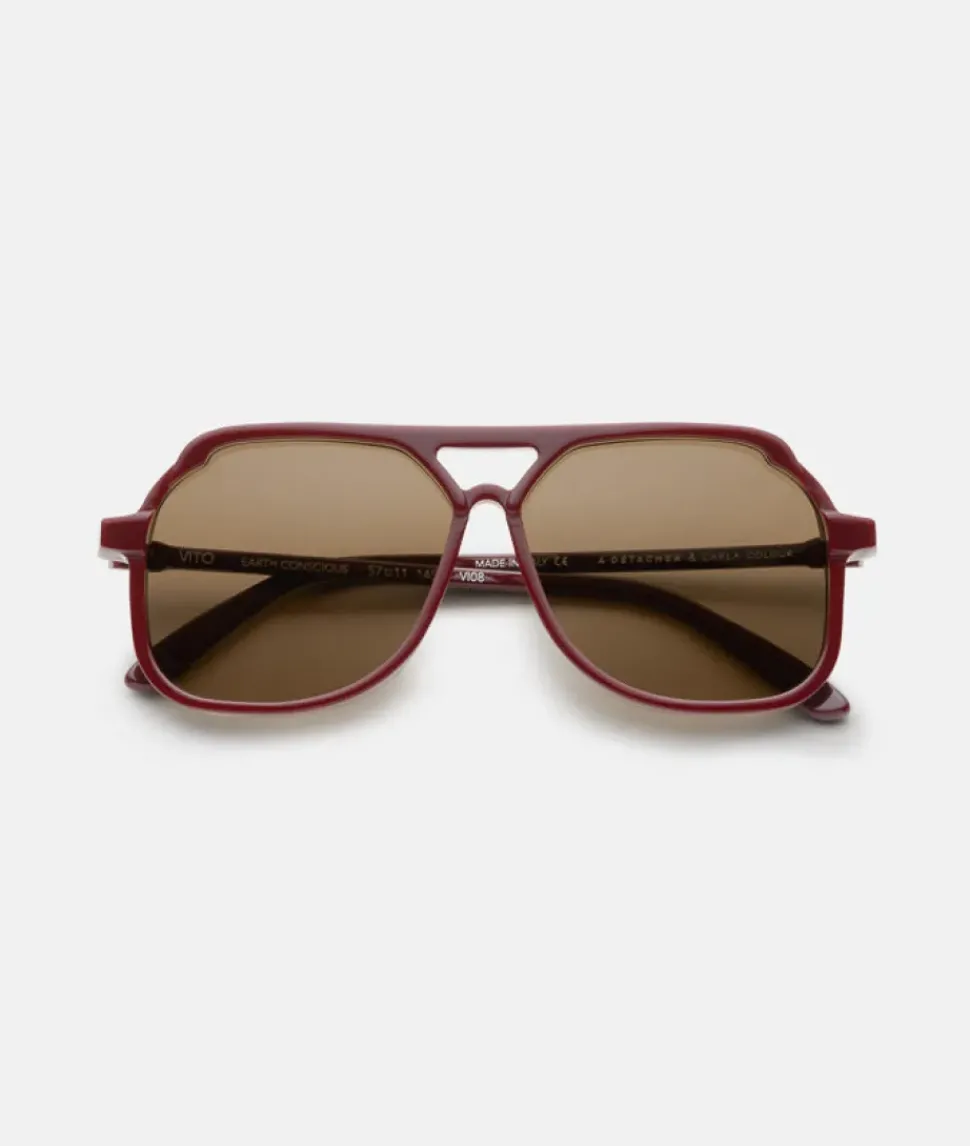 Deep red eco acetate frame with dark brown bio nylon lens.